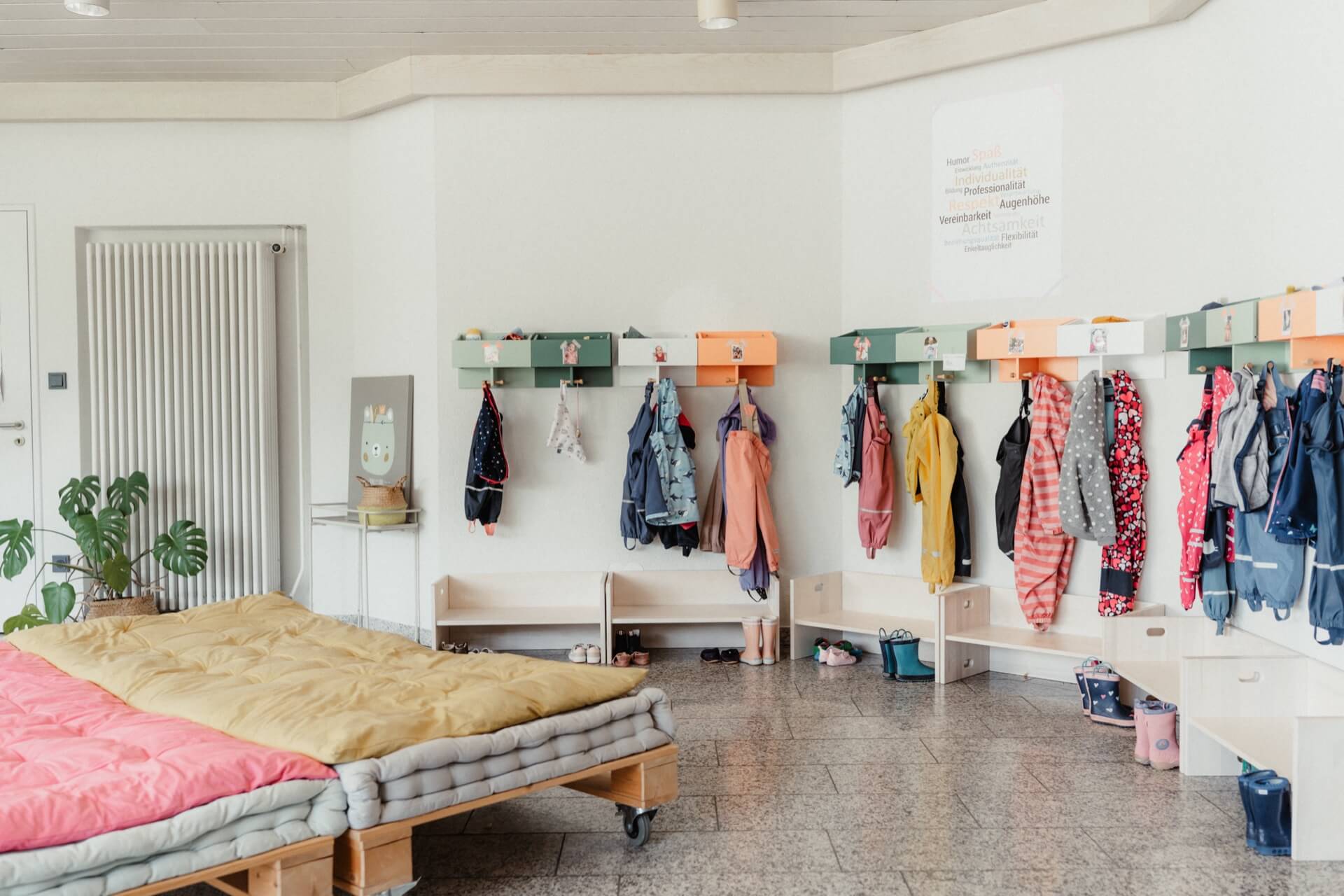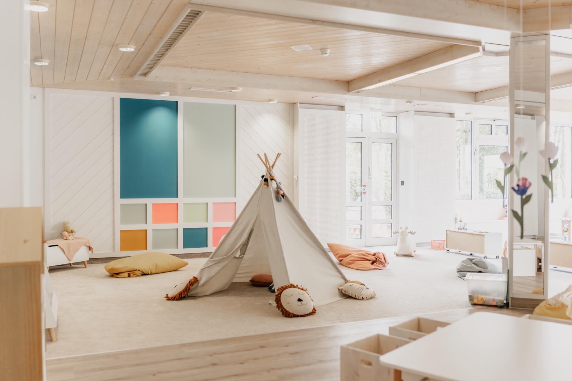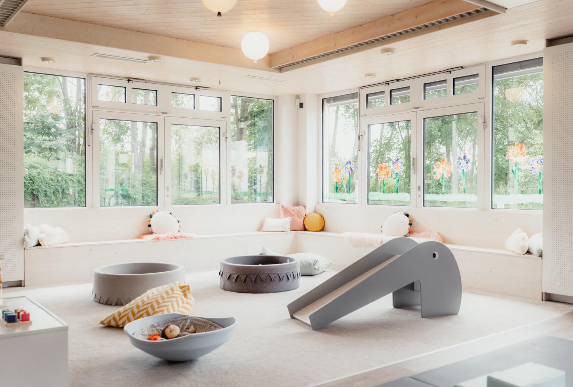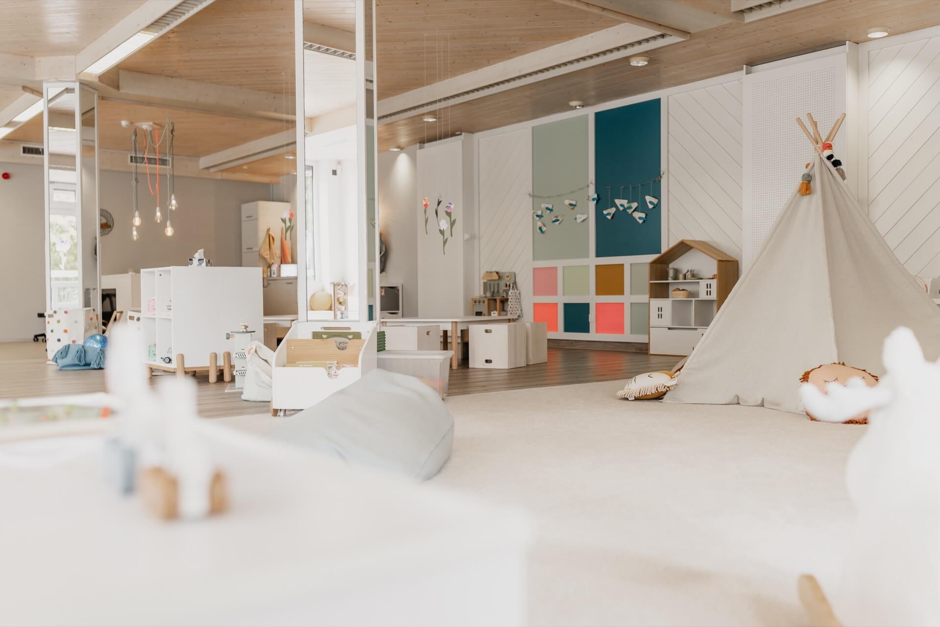 Zusätzlich gibt es einen separaten Schlafbereich, in dem die Kleinsten ungestört ihre Ruhepausen genießen können. Mit der durchdachten, altersgerechten Ausstattung schaffen die Räumlichkeiten unserer Mini-Kita eine geborgene Atmosphäre, in der Kinder spielerisch lernen und sich entfalten können.